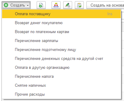 При создании нового документа выбирается вид операции в соответствии с назначением платежа: