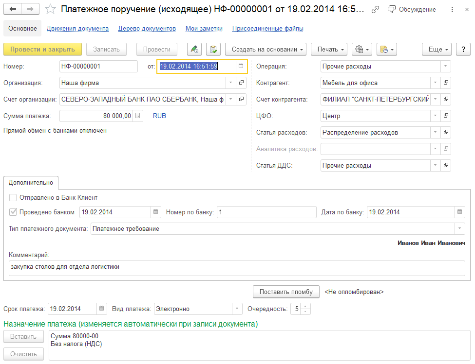 Документ «Платежное поручение (исходящее)»