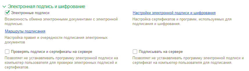 - Настройки электронной подписи и шифрования