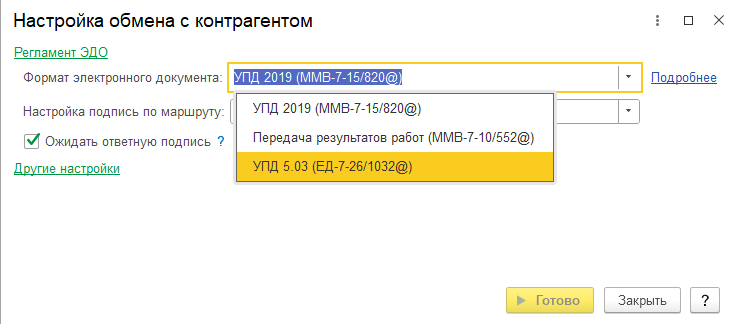 Если вам потребуется внести какие-либо изменения в существующую формат настройки обмена, то откройте существующую настройку, двойным щелчком по гиперссылке в столбце "Регламент ЭДО" откройте настройку обмена с контрагентом по конкретному виду документа и смените формат Электронного документа.
