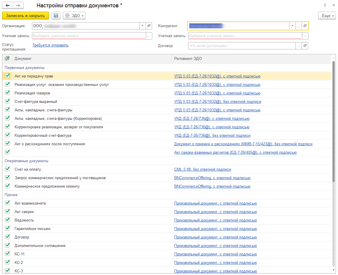 Для подключения контрагента к обмену необходимо отправить ему приглашение к обмену. Для этого нужно его создать в обработке Документы ЭДО.