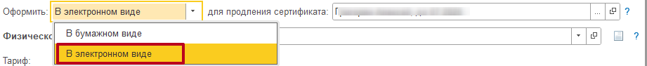 - Выбрать вариант подачи заявления в поле "Оформить" — в бумажном виде или в электронном виде. Если выбираете оформление в электронном виде, то необходимо выбрать сертификат, которым будет подписано заявление.