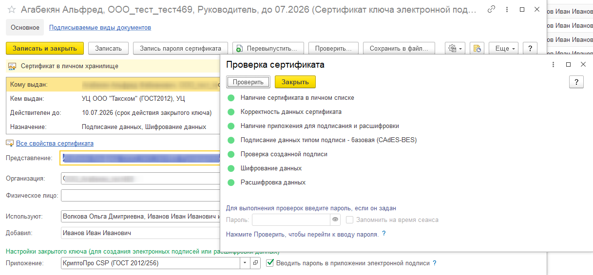 В шапке карточки доступны команды для записи пароля, проверки и сохранения в файл сертификата.