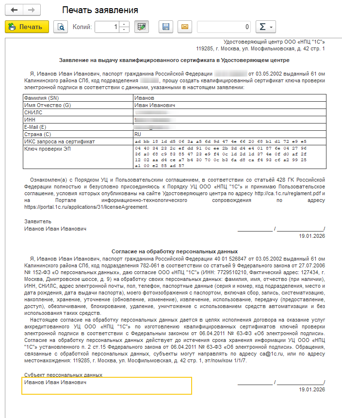 Ознакомьтесь с условиями соглашения о присоединении к регламенту удостоверяющего центра и распечатайте заявление.