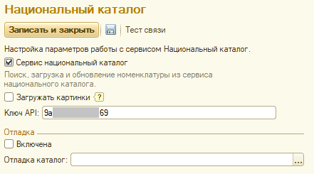 Для работы с сервисом установите флаг «Сервис национальный каталог» и укажите ключ API. Чтобы при создании карточки номенклатуры загружались картинки - установите соответствующий флаг.