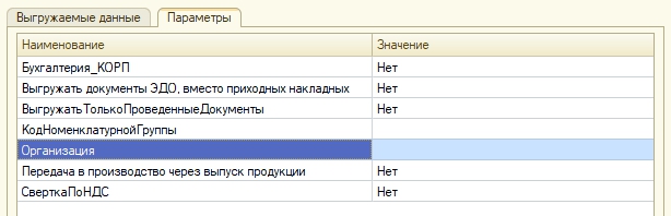 - выгрузка обособленных подразделений в «1С: Бухгалтерия» версии КОРП — для параметра «Бухгалтерия_КОРП» указываем значение Да.