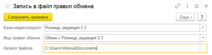 2. Сохранить правила обмена для Розницы в файл по кнопке «Сохранить в файл правила обмена с конфигурациями 1С». В открывшемся диалоговом окне в поле «База-корреспондент» следует выбрать вариант Розница, редакция 2.2.