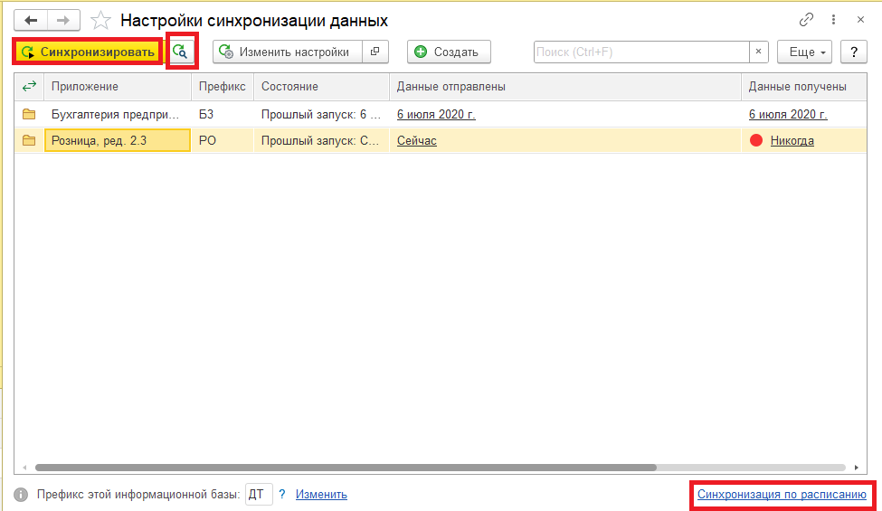 По гиперссылке "Синхронизации по расписанию" открывается обработка Сценарии синхронизации данных для: Розница, ред. 2.3 «Расписание».