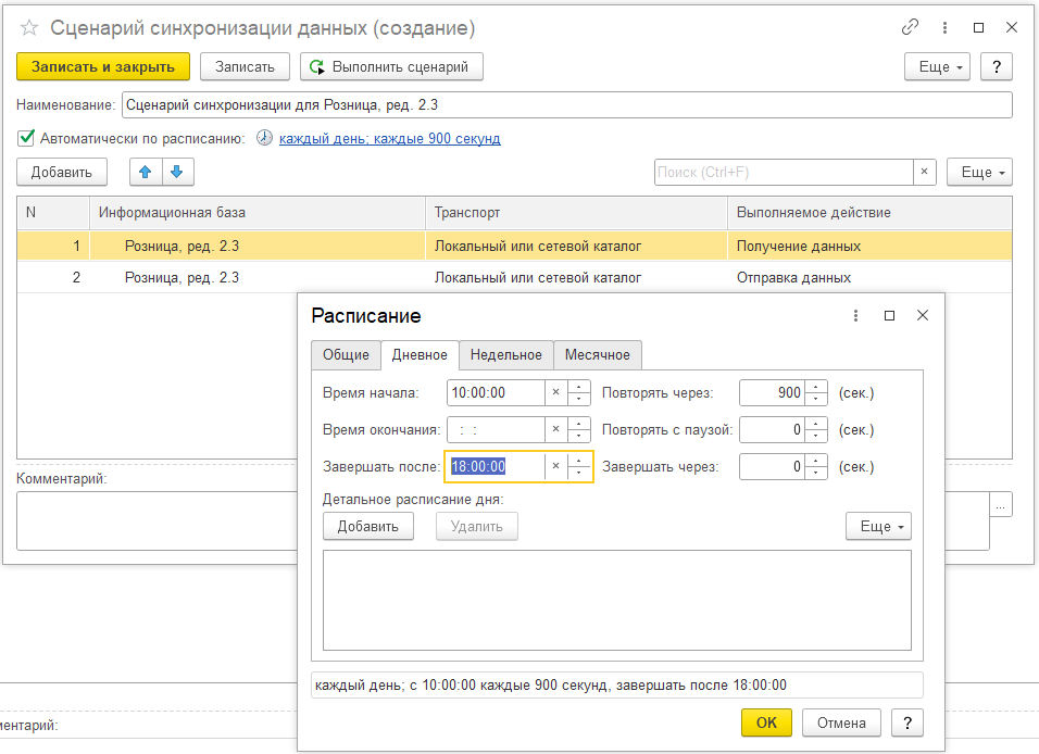 При прямом подключении к информационной базе Розницы достаточно произвести настройку обмена данными по расписанию только в конфигурации «ДАЛИОН: ТРЕНД».