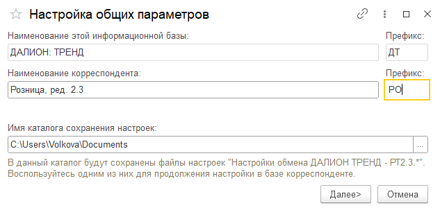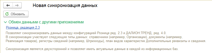 Настройка обмена производится через помощника настройки обмена и первоначально выполняется в информационной базе «ДАЛИОН: ТРЕНД», затем завершается в конфигурации «Розницы».