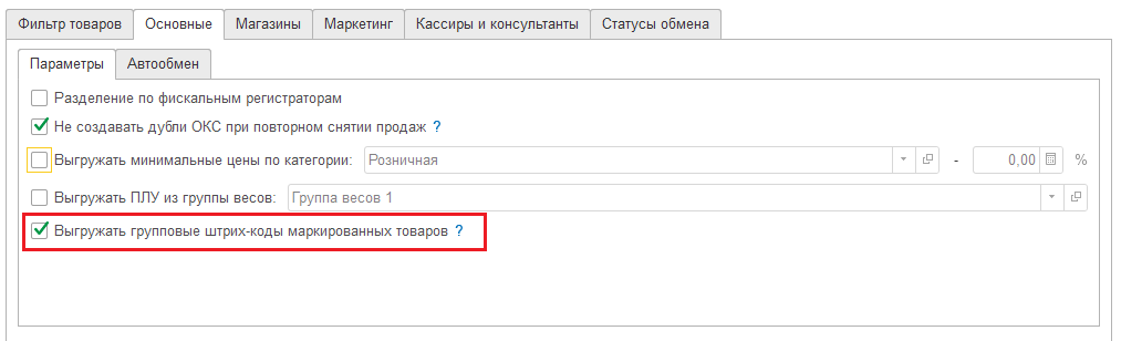 Для выгрузки групповых штрих-кодов маркированных товаров добавлена соответствующая настройка на закладке «Основные»