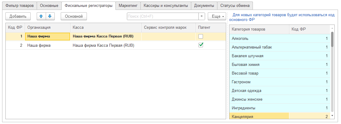 - При установке разделения по фискальным регистраторам появляется дополнительная закладка «Фискальные регистраторы», на которой производится сопоставление категорий товаров, организаций и касс в ДАЛИОН с кодами ФР. Необходимо, чтобы коды ФР совпадали с кодами соответствующих ФР-ов в кассовом ПО.
