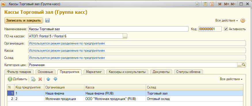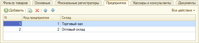 Если одновременно с разделением по предприятиям используется и разделение по ФР, тогда на закладке «Предприятия» сопоставляются только коды предприятий и склады (организации и кассы сопоставляются в настройке ФР).