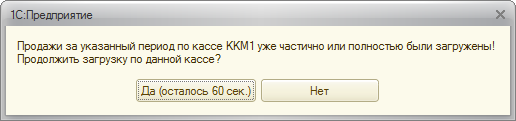 - Флаг Предупреждать о повторной загрузке продаж позволяет контролировать уникальность информации о продажах в системе. При выгрузке повторных данных из ККМ будет выводиться уведомление: