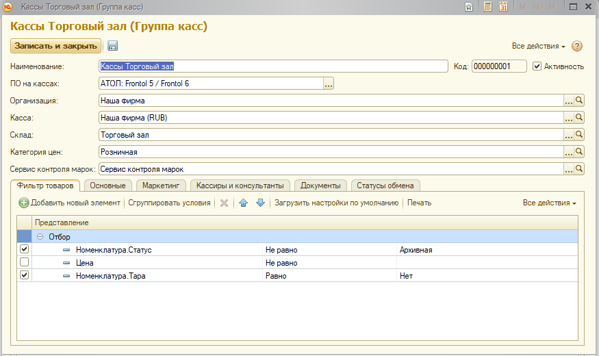 Для удобства настройки отдельные кассы с одинаковыми параметрами загрузки/выгрузки объединяются в группы в справочнике «Группы касс» В такие группы, как правило, легко объединяются линейки касс, установленные в одном торговом зале. Необходимые условия для объединения заданы реквизитами шапки элемента Группа касс: организация, касса, склад, категория цен и ПО на кассах.