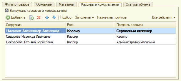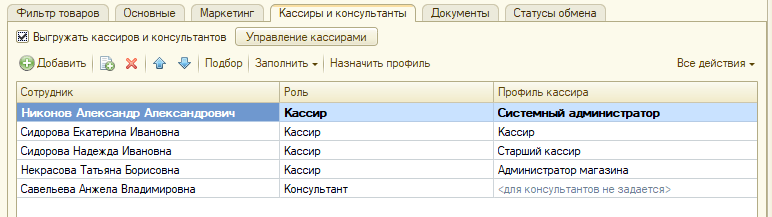 - На закладке «Кассиры и консультанты» настраивается возможность выгрузки сотрудников в кассовое ПО.