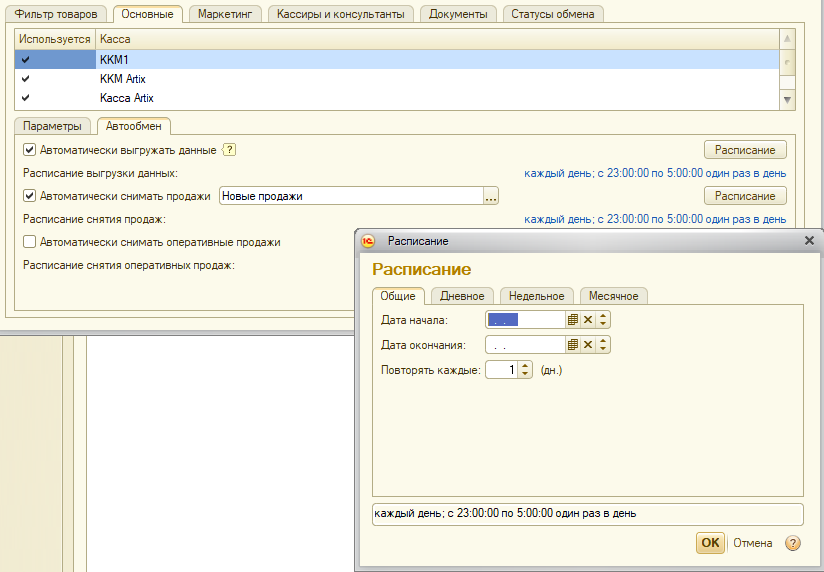 Расписание автоматического снятия продаж, а также выгрузки в кассовое ПО данных о товарах, клиентах, картах и скидках задается на закладке «Основные\Автообмен».