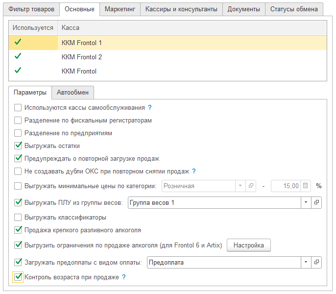- Флаг Продажа крепкого разливного алкоголя необходима для функционала продажи разливного алкоголя (актуально только для Frontol 6).