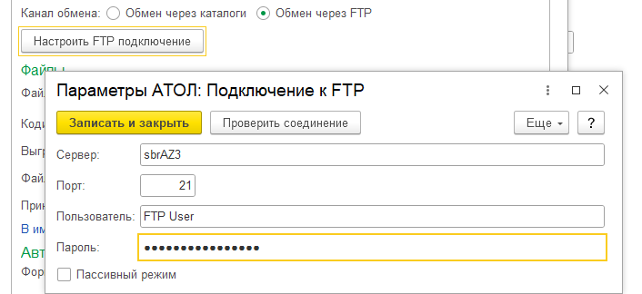 Обмен через FTP настраивается по кнопке «Настроить FTP подключение». В диалоговом окне указываются сервер, порт (по умолчанию 21), имя пользователя и пароль. Пассивный режим включается при необходимости.