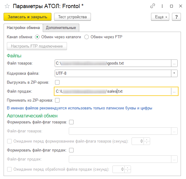 - посредством файлов. Указываются пути к файлам товаров (файл выгрузки) и к файлам продаж (файл загрузки), возможность использования ZIP-архивов.