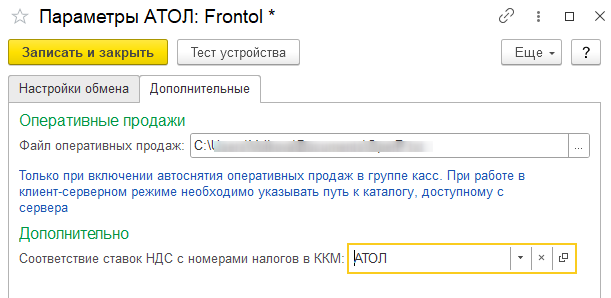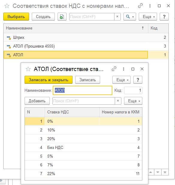 Для этого выбираем нужную настройку из справочника «Соответствия ставок НДС с номерами налогов в ККМ». По умолчанию в справочник добавлены настройки для фискальных регистраторов АТОЛ и ШТРИХ.