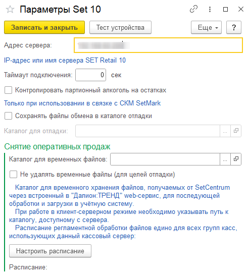 Обмен с «Set: Retail 10» реализуется через web сервис, поэтому в параметрах кассы необходимо указать адрес сервера для обмена (по умолчанию используется порт 8090, но при необходимости вы можете указать другой порт). Для сохранения файлов загрузки и выгрузки следует проставить флаг «Сохранять файлы обмена в каталоге для отладки» и указать каталог отладки. Добавление магазинов и дальнейшая настройка осуществляется в группе касс.