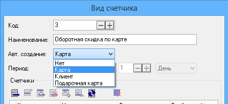 Принцип работы с оборотными скидками настраивается на кассе. В пункте меню Frontol Администратор/Скидки и сценарии/Счетчики создаем счетчик оборотов, в поле «Авт. создание» выбираем Карта или Клиент.