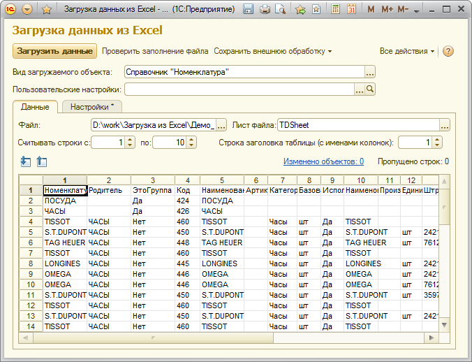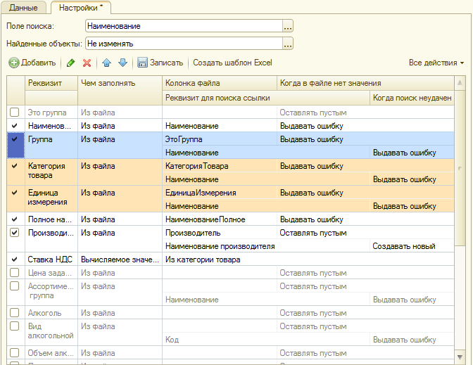 - когда в файле Excel нет значения для загружаемого реквизита: Оставлять пустым или Выдавать ошибку. Для некоторых реквизитов всегда будет выдаваться ошибка;