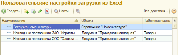 Также в системе предусмотрена возможность выгрузить в файл пользовательские настройки загрузки данных из Excel по кнопке Все действия/Сохранить настройку в файл, расположенной в правом верхнем углу табличной части на закладке «Настройки». Загрузить настройки из файла можно по команде Все действия/Прочитать настройку из файла.