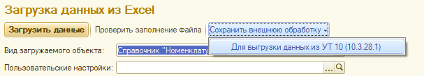 Для удобства перехода с программного продукта УТ 10 на ДАЛИОН: ТРЕНД из обработки «Загрузка данных из Excel» сохраняем внешнюю обработку для выгрузки данных по команде Сохранить внешнюю обработку.