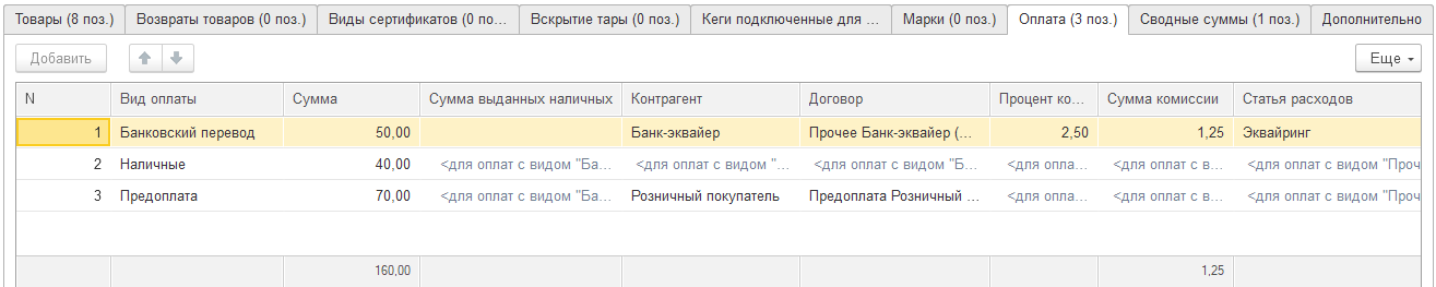 На закладке «Оплата» указывается вид оплаты, сумма оплаты по каждому виду, а также данные по эквайрингу (контрагент, договор контрагента, процент комиссии, сумма комиссии и статья затрат для типов оплаты «Прочее» или «Банковские карты»).