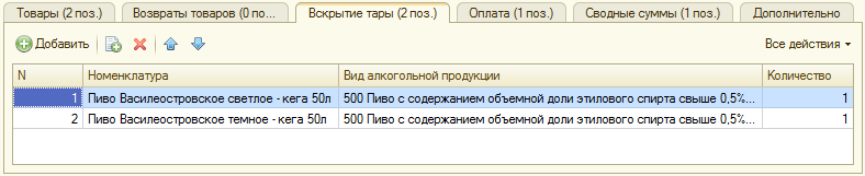 На закладке «Вскрытие тары» содержится информация о количестве вскрытых пивных кег.
