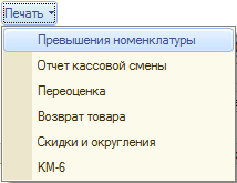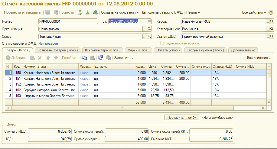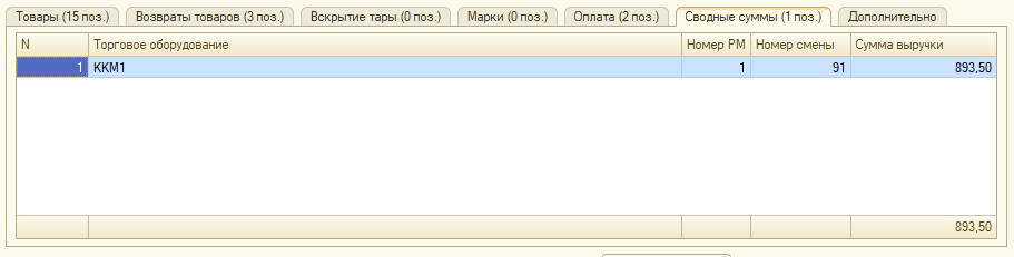 В зависимости от настроек ККМ округления подпадают в пункт «Сумма округлений» при округлении стоимости товаров в чеке или в пункт «Сумма округлений ККМ» при округлении суммы чека (при этом расходы будут отнесены на статью затрат, указанную на закладке «Дополнительно»). Сумма документа и сводные суммы вычисляются с учетом округлений. - выручка ККТ (выводится значение равное сумме ОКС за вычетом округлений).