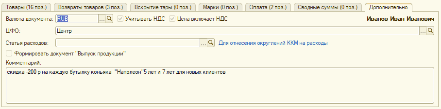 На закладке «Дополнительно» отображены: валюта документа, политика учета НДС, ЦФО (подставляется автоматически по ТО; можно изменить), Статья расходов, на которую упадут расходы по округлениям, в комментарии находится информация о дате создания документа и может быть вписаны любые другие сведения.