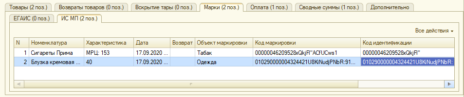 На закладке «Марки» содержится информация о проданной маркированной продукции.