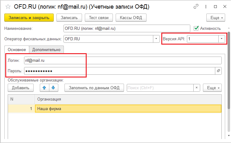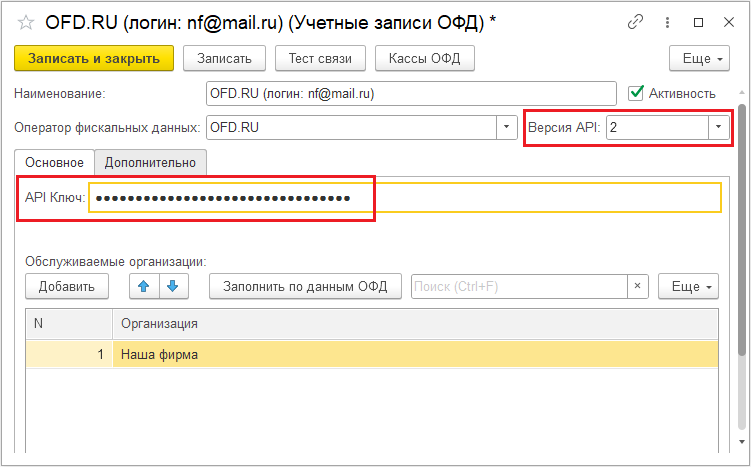 2 версия — на закладке "Основное" заполняется API ключ который можно получить через личный кабинет в ОФД.