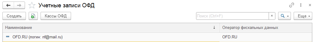 Список учетных записей хранится в регистре сведений, который вызывается из раздела "Обмен с сервисами" подсистемы "Интеграция" по гиперссылке "ОФД".