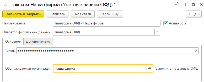 На закладке "Основное" заполняется Токен для авторизации, откуда будут загружаться сведения о продажах. Проверить правильность заполнения можно по кнопке "Тест связи".
