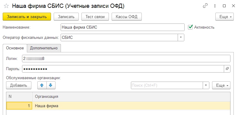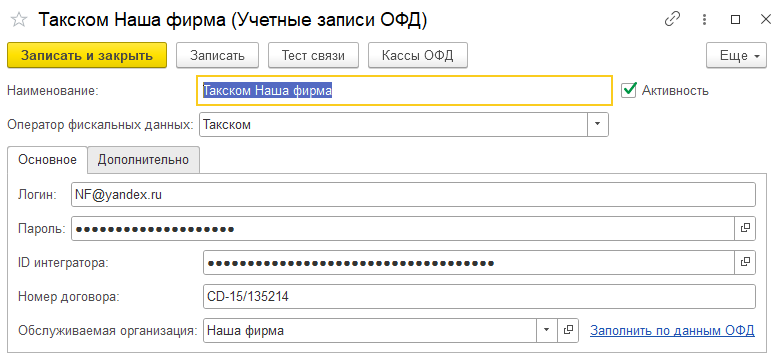 На закладке "Основное" заполняется Логин, Пароль. Проверить правильность заполнения можно по кнопке "Тест связи".