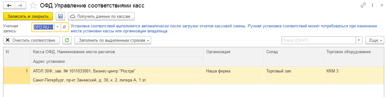 Из формы учетной записи по кнопке "Кассы ОФД" открывается обработка "ОФД Управление соответствиями касс". Учетная запись подставляется автоматически.