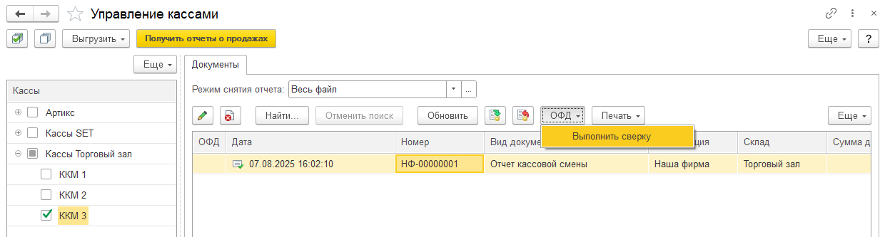При необходимости сверку можно запустить по кнопке "ОФД - Выполнить сверку".