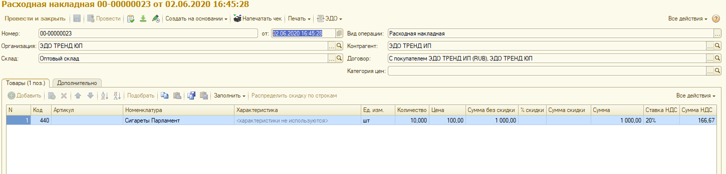 Для передачи расходных документов по ЭДО на основании документов Возврат товаров поставщику и Расходная накладная вводится специальный документ — «Документ ЭДО (исходящий)».