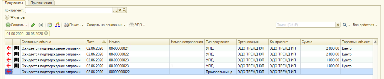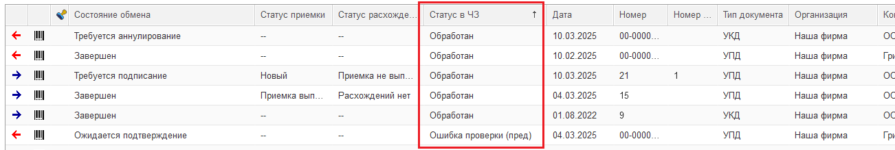В форме списка документов статусы проверки отображаются в отдельной колонке. По неподписанным УПД, УПДи: Проверка пройдена (пред) или Ошибка проверки (пред). Если документ не подлежит проверке или ещё не прошёл её, статус не отображается. По всем подписанным УПД, УПДи, УКД: Обработан или Ошибка обработки.