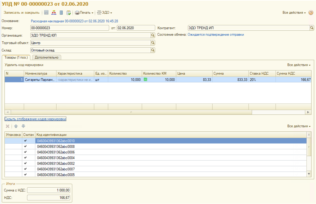 При передаче маркированного товара коды маркировки необходимо считать непосредственно в исходящий документ ЭДО. В документ могут быть считаны как коды маркировки каждой единицы товара, так и упаковки (агрегата).