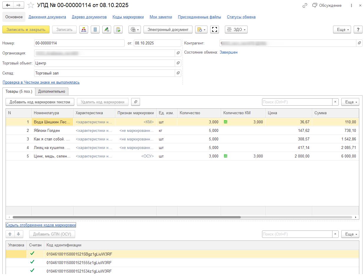 Порядок работы с исходящим УПД содержащим маркированный товар