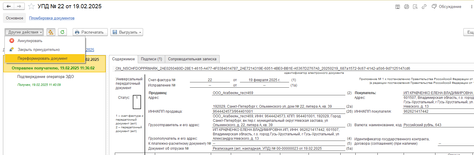 Переформирование возможно, только если документ еще не был отправлен покупателю. После отправки документа внесение каких-либо изменений в УПД уже невозможно.