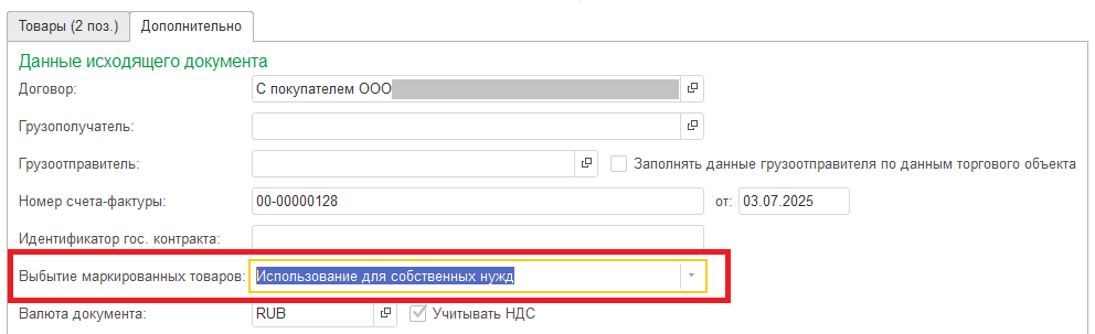 Если вы отправляете УПД с маркированным товаром контрагенту, который не является участником оборота маркированных товаров, например, приобретает товар для собственных нужд - у вас есть возможность указать в УПД на закладке дополнительно причину выбытия маркированного товара из оборота.