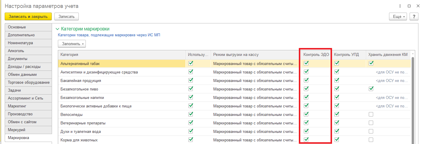 Такой запрет включается отдельно на каждую категорию маркированной продукции в Настройках параметров учета в разделе Маркировка настройкой "Контроль ЭДО".