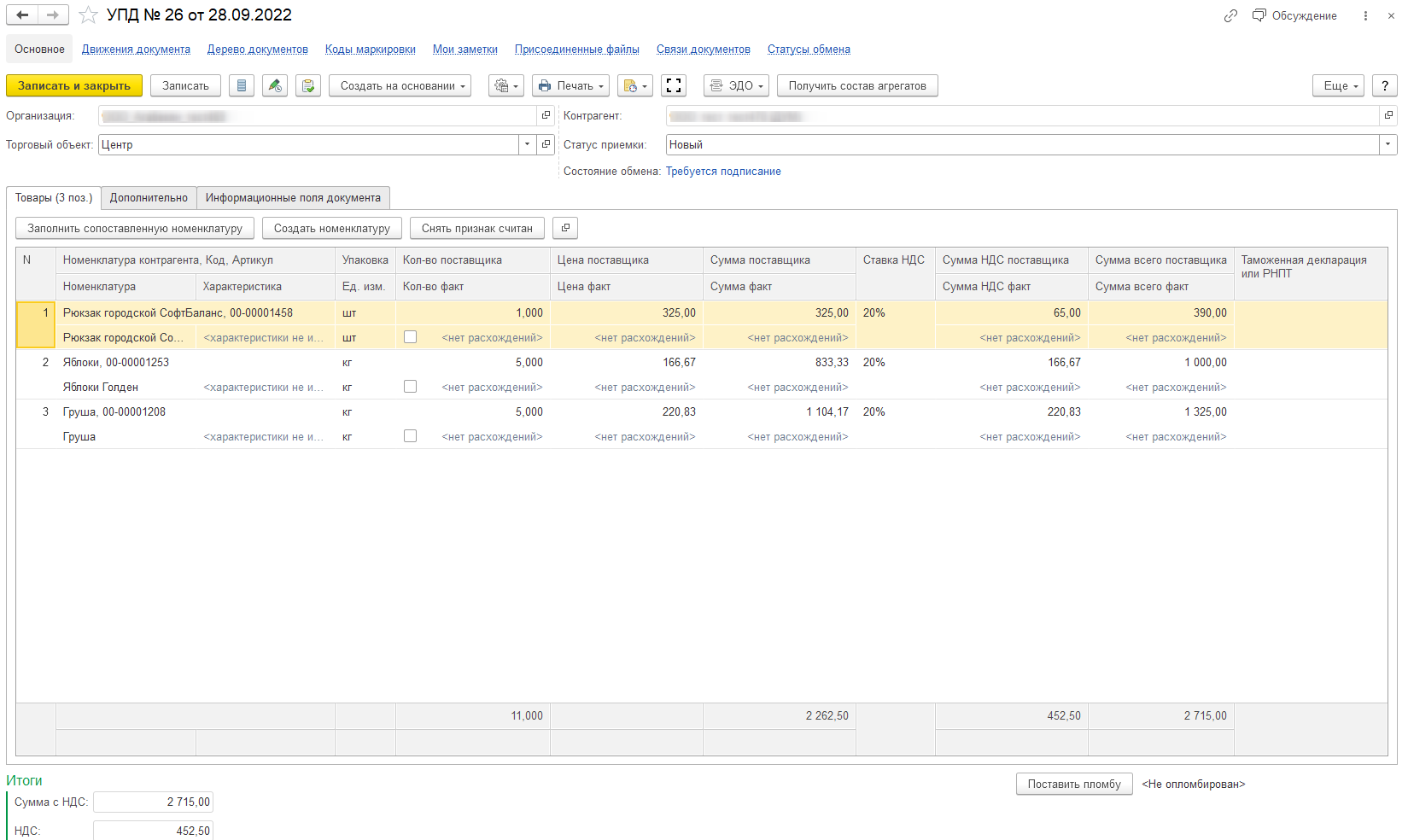 Если вы отправили Акт расхождения и после этого подписали исходную УПД в ней будет указано "Товары приняты с расхождениями (претензиями)", поэтому важно сначала отправлять Акт расхождения и только после этого подписывать входящую УПД.