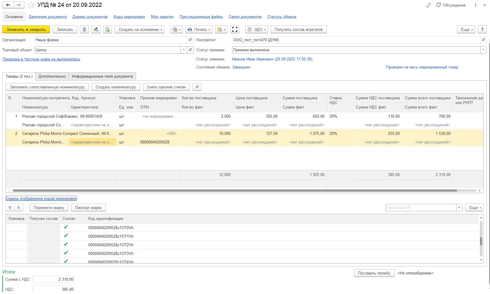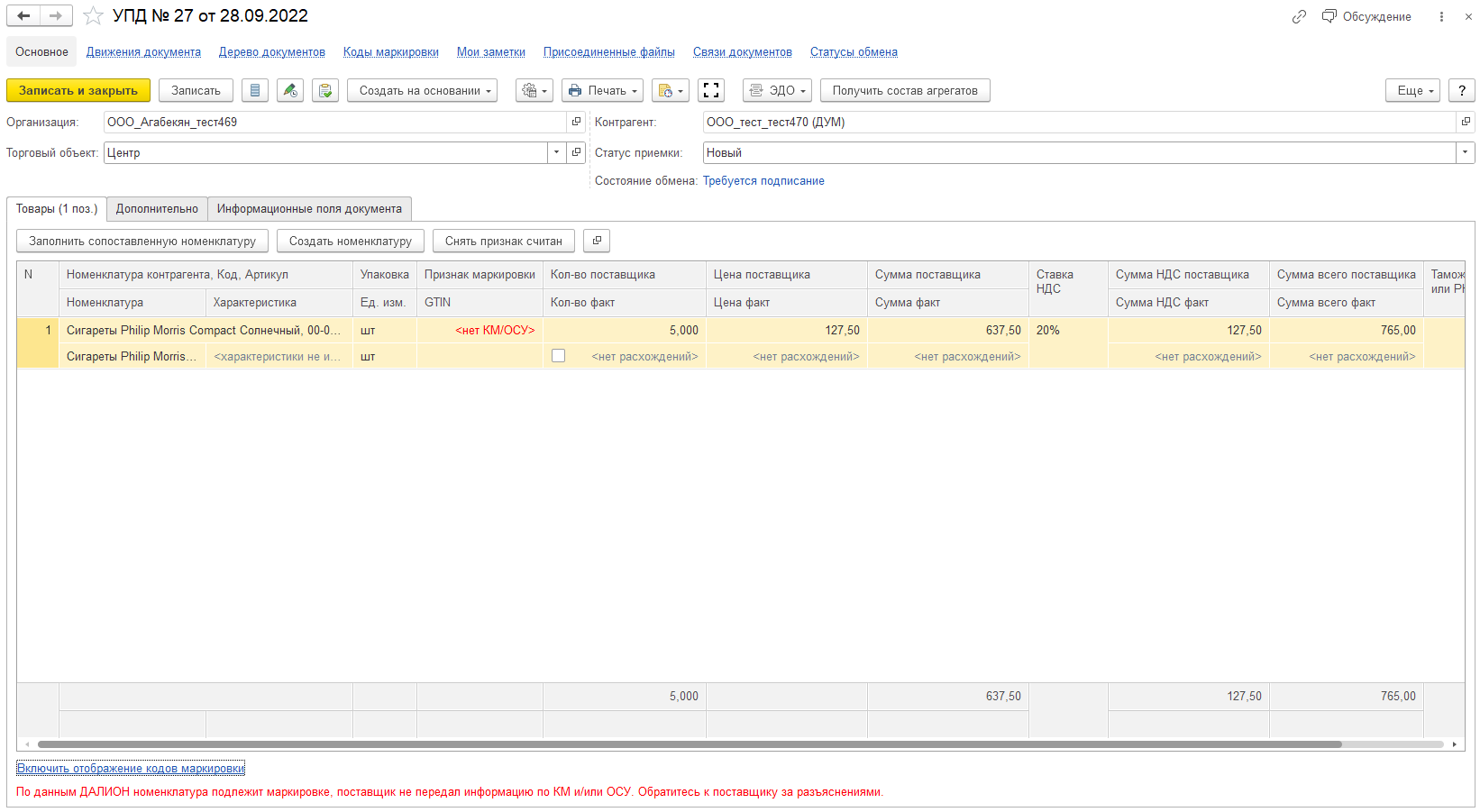 - Если документ подписан, то данные по маркам будут переданы в Честный Знак и произойдет смена владельца, в том числе и по проблемным маркам.
